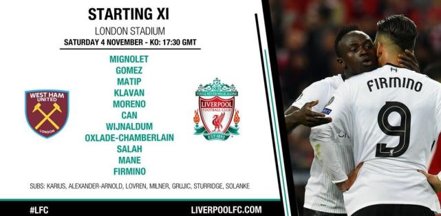 腾讯体育讯 北京时间11月5日凌晨1时30分,2017-18赛季英超第11轮,利物浦做客挑战西汉姆,双方首发阵容已经公布。