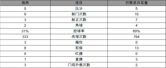 全场比赛,巴黎圣日耳曼15次攻门7次射正打入5球,昂热9次攻门3次射正颗粒无收。巴黎的控球率达到69%,昂热只有31%。