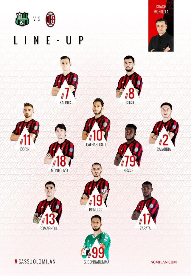 腾讯体育讯 北京时间11月6日凌晨3时45分,意甲第12轮一场焦点战,AC米兰客场对阵萨索罗队。腾讯体育将带来视频直播。赛前双方首发阵容已公布。米兰方面,博努奇解禁复出重回首发,安德烈-孔蒂、比格利亚、博纳文图拉都因为伤病缺席,蒙托利沃不得不在中场首发顶替。苏索、恰尔汗奥卢和卡利尼奇组成攻击线搭档。萨索罗队方面,贝拉尔迪、阿尔弗雷德-邓肯、德尔奥尔科、戈尔达尼加等6名干将因伤缺席。