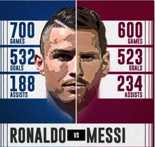 从两人的数据对比看,C罗虽然比梅西多踢了100场比赛,但是打入的进球数仅比梅西多9个,而助攻次数少了46次。从效率上看,梅西的场均进球数以及场均助攻数也全部高过C罗。从两人的年龄上考虑(梅西1987年出生今年30岁,C罗1985年出生今年32岁),C罗想要在这一数据上超越梅西基本无望。
