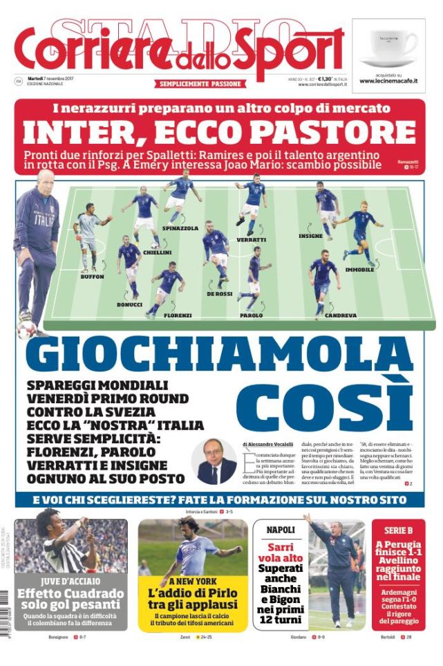 在《罗马体育报》看来,面对瑞典,文图拉不会在客场选择保守的踢法,他的球队会积极主动的进攻,意大利很可能选择433的阵型来面对瑞典。