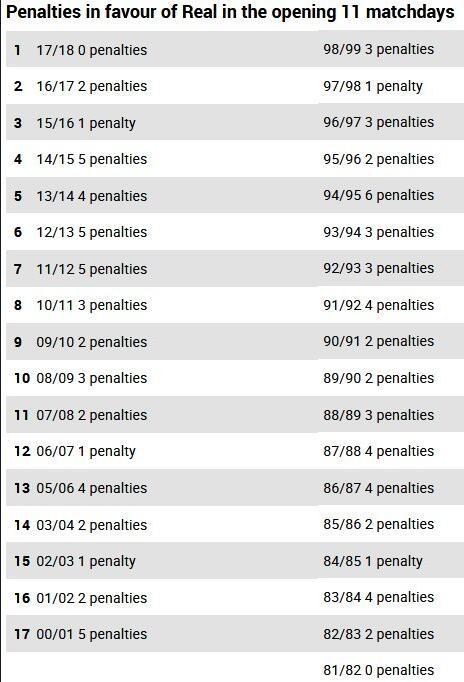 《马卡报》盘点了自从1981-82赛季以来,皇马在同期的点球数,而在之前的35个赛季,皇马至少拿到1个点球,在1994-95赛季甚至拿到过6个点球,在2000-01赛季、2011-12赛季、2012-13赛季和2014-15赛季,皇马拿到的点球也有5个,可是本赛季,这个数字是尴尬的0,这样的光景,还是36年来首次。