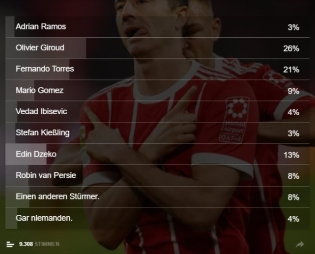 目前德国媒体也为拜仁出主意,《慕尼黑日报》发起了一项调查,目前问卷还在进行中,而截止到目前,阿森纳锋霸吉鲁的支持率是最高的,达到了26%,其次是马竞锋霸托雷斯,支持率是21%,罗马锋霸哲科排名第三,支持率是13%。也有球迷呼吁让马里奥-戈麦斯重回安联球场,他的支持率是9%,范佩西的支持率是8%,伊比舍维奇的支持率则是达到了4%。