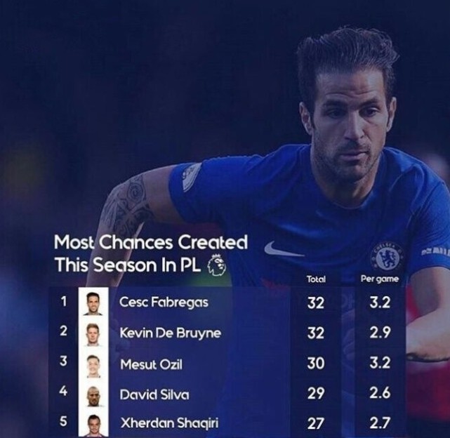 腾讯体育讯 北京时间11月8日,本赛季的英超赛场,切尔西发挥不理想,目前排名联赛第四位,距离榜首的曼城多达9分。不过球队的中场核心法布雷加斯的表现却无可挑剔,西班牙人依然扮演着球队中场指挥官的角色。根据统计,在本赛季的英超创造机会排行榜上,小法排名榜首。