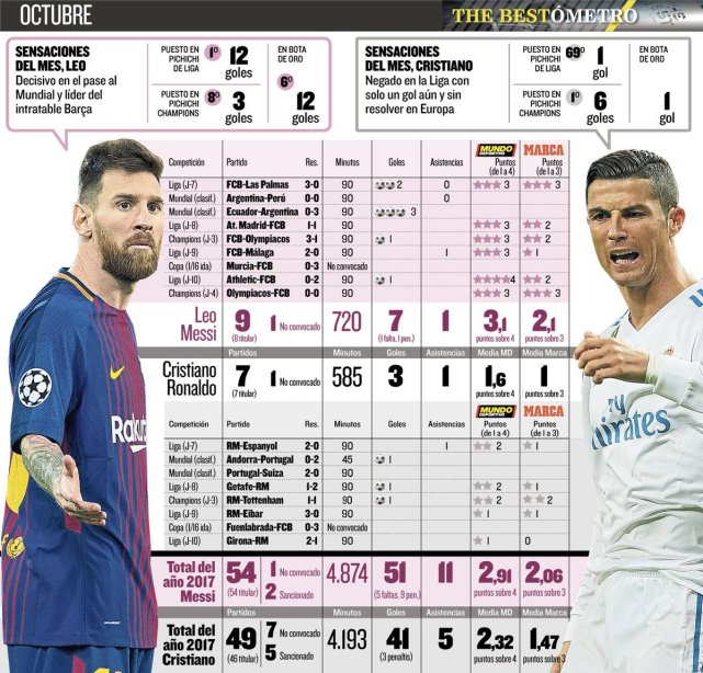 进入10月份以来,梅西的状态也更为理想,他打入了7个进球,而C罗打入了3球,两人的助攻数都是1个。在10月份的国家队比赛里,梅西的表现也更出色,在世预赛最后一轮,梅西上演帽子戏法,帮助阿根廷晋级世界杯。虽然C罗领军的葡萄牙也逆袭了瑞士,但是皇马天王没有在最后一战破门。根据两大巨星在10月份以来的发挥,《世界体育报》给梅西的评分是3.1分,给C罗的评分是1.6分,《马卡报》给梅西的评分是2.1分,给C罗的评分是1分。