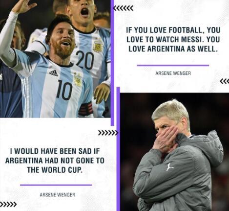 在此前的南美区世预赛最后一轮比赛中,梅西上演帽子戏法帮助阿根廷逆转击败厄瓜多尔,最终惊险晋级。温格表示:“我个人非常高兴看到梅西打进了世界杯,如果你热爱足球,你就喜欢看梅西的比赛。如果你热爱足球,你也会爱阿根廷。他们总是有一流的进攻球员,有太多的天才。如果阿根廷没能打进世界杯,我会难过。”