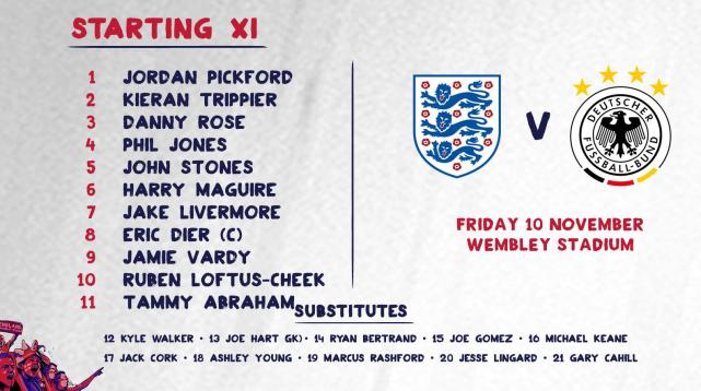 腾讯体育讯 北京时间11月11日4时,国际足联友谊赛,英格兰坐镇温布利球场迎战德国。两队赛前公布首发阵容,奇克、亚伯拉罕、皮克福德三名球员完成英格兰处子秀,哈尔斯滕贝格则完成德国处子秀。