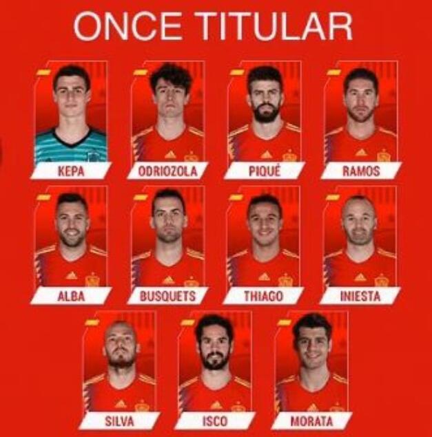 西班牙(4-3-3):科帕;奥德里奥索拉,皮克,拉莫斯,阿尔瓦;布斯克茨,蒂亚戈,伊涅斯塔;席尔瓦,莫拉塔,伊斯科