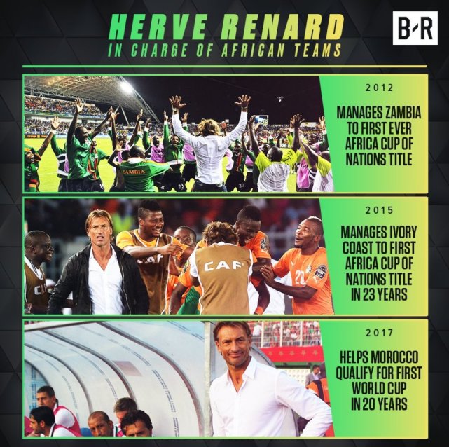 然而这还不是奇迹的终章,在2018俄罗斯世界杯预选赛中,勒纳尔执掌的摩洛哥队在附加赛中客场2:0战胜老东家科特迪瓦,时隔20年重返世界杯。有些老球迷可曾记得,摩洛哥上一次出战世界杯还要追溯到1998年法国世界杯。最后一轮预选赛前摩洛哥积9分排在C组第1,科特迪瓦积8分排第2,末轮摩洛哥和科特迪瓦直接交锋,打平就可以晋级的摩洛哥最终在客场2-0击败科特迪瓦,尤文中卫贝纳蒂亚破门,最终摩洛哥如愿获得参加明夏世界杯的入场券。3次率领非洲球队完成前人难得创造的奇迹,勒纳尔无愧“非洲足球教父”的称号。
