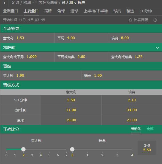 意大利vs瑞典主要赔率