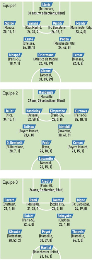 同时《队报》认为阵容厚度惊人的法国甚至有能力派出三套首发。门将是巴黎的替补门将奥雷拉,四名后卫是斯图加特的帕瓦德,马赛的拉米以及前切尔西后卫祖玛,还有巴萨的左边后卫迪捏。中场五人是巴黎的拉比奥特,切尔西的巴卡约科、热刺的西索科、马赛的帕耶与托万,而在锋线上是效力于曼联的前锋马夏尔。