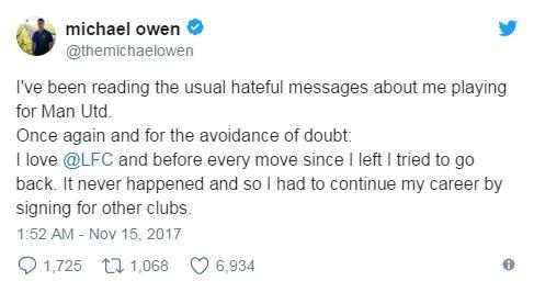腾讯体育讯 北京时间11月15日,前几日,欧文在接受采访时谈到了自己加盟曼联的往事,在采访中他表示要感谢当年本泽马选择到皇马踢球才让自己有了加盟曼联的机会。而红军球迷们对于欧文用“感谢”一次非常的不满。据英国媒体《利物浦回声报》的消息,近日欧文更新了自己的推特,对此事进行了回应,他表示自己深爱红军,只是为了职业生涯的延续才加盟的曼联。