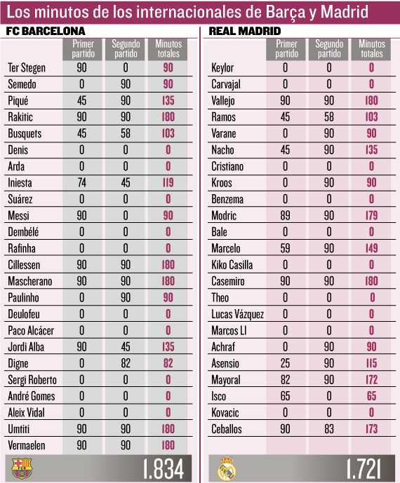 此外有多达五名巴萨球员出场了180分钟,他们分别是克罗地亚国家队的拉基蒂奇、荷兰国家队的西莱森、阿根廷国家队的马斯切拉诺,法国国家队的乌姆蒂蒂和比利时国家队的维尔马伦。皇马方面,只有两名球员踢满了180分钟,分别是巴列霍和卡塞米罗,莫德里奇踢了一场90分钟,另外一场比赛在第89分钟被换下。