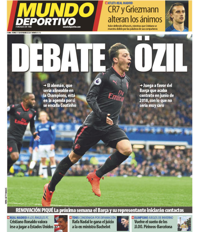 《世界体育报》在今天的封面上透露,一旦巴萨无法拿下库蒂尼奥,那么厄齐尔也是一个选择。目前德国人和阿森纳的续约合同一直没有下文,明年夏天,厄齐尔就会成为自由人,为了避免他免费走人,阿森纳可能会在冬窗甩卖厄齐尔。西媒透露,巴萨运作厄齐尔加盟的话,那么价格不会高,另外一个潜在的好处是,阿森纳没有进入本赛季的欧冠,厄齐尔如果披上巴萨战袍,还能代表俱乐部踢欧冠,而库蒂尼奥则不行。