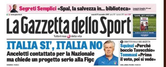 腾讯体育11月17日讯 此前意大利国家队主场0-0战平瑞典国家队,总比分0-1无缘2018俄罗斯世界杯,随后足协宣布解雇了主帅文图拉。据悉意大利足协的候选人包括切尔西主帅孔蒂、尤文图斯主帅阿莱格里、前国际米兰主帅曼奇尼,以及刚刚离开拜仁慕尼黑的安切洛蒂。意大利的新帅人选已经锁定大牌教练,而最新报道,意大利足协已经开始接触安切洛蒂。