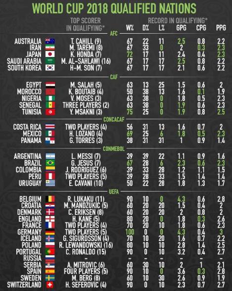 腾讯体育讯 北京时间11月16日,目前参加明夏世界杯的32支球队已经全部出炉,而著名的足球数据媒体《whoscored》也对32支出线球队在世预赛中的胜率、场均进球数、场均得分、以及队内的最佳射手的情况进行了一番统计。德国队在本届世预赛胜率最高,达到100%,而亚洲球队日本的胜率为72%,是亚洲胜率最高的球队。