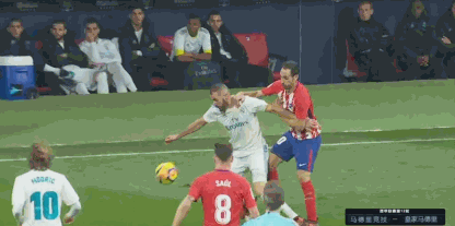 戈丁放倒本泽马,安赫尔-科雷亚大脚踢球,正中本泽马头部,双方为此发生激烈冲突。