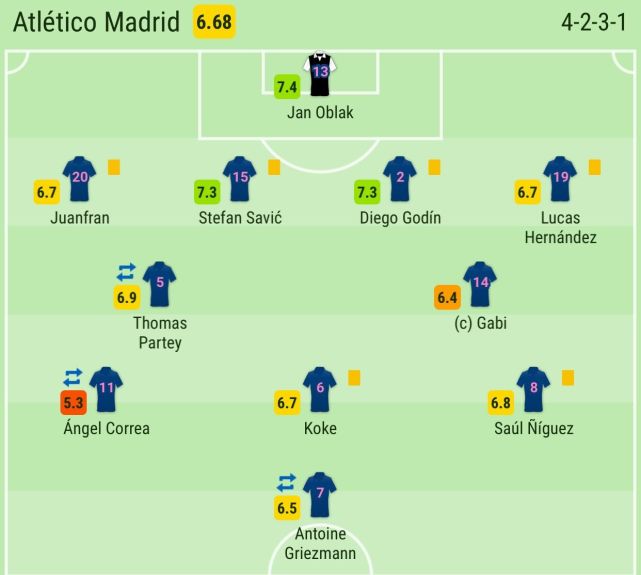 马德里竞技首发:13-奥布拉克;20-胡安弗兰、15-萨维奇、2-戈丁、19-卢卡斯-埃尔南德斯;5-托马斯-帕尔特伊(54'10-卡拉斯科)、14-加比;11-科雷亚(77'21-加梅罗)、6-科克、8-萨乌尔;7-格列兹曼(76'9-托雷斯)