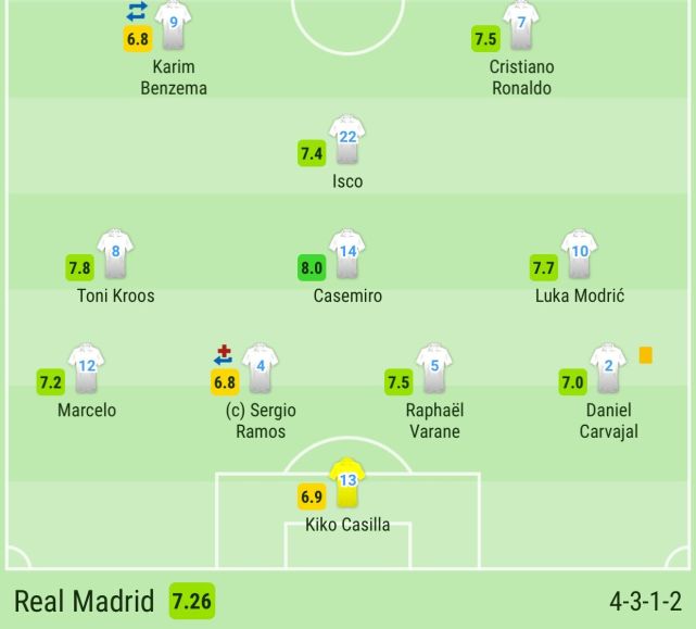 皇家马德里首发:13-卡西利亚;2-卡瓦哈尔、5-瓦拉内、4-拉莫斯(46'6-纳乔)、12-马塞洛;10-莫德里奇、14-卡塞米罗、8-克罗斯;22-伊斯科;7-C罗、9-本泽马(76'20-阿森西奥)