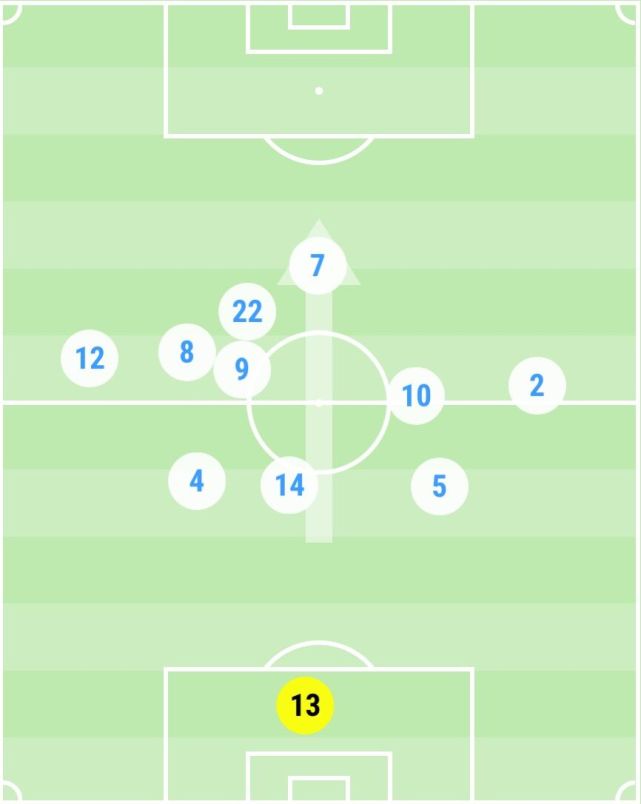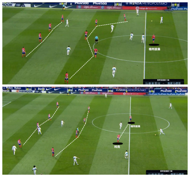 马竞此役阵型在4-5-1与4-4-2之间切换,阵地防守时在前场只留下格列兹曼一人,有时科克要拉出来协助他参与到逼抢之中。