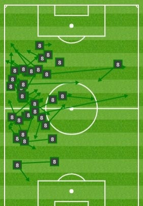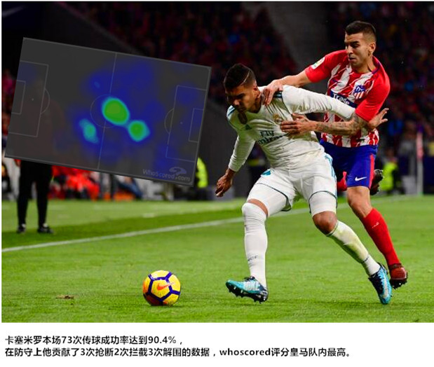 卡塞米罗此役很少像过往一样参与中场组织甚至插上送威胁球或射门,他的活动区域基本集中在本方半场,专心防守且多次破坏马竞反击,也能及时将球转移到弱侧区域。正因有他在后场的高效拦截才促使莫德里奇、克罗斯二人有更多前压的机会,卡塞米罗本场奉献了顶级发挥。