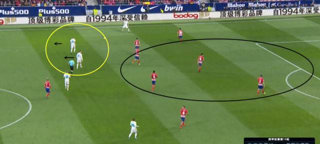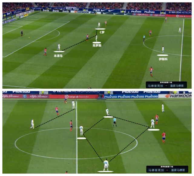 马竞防守落位速度极快且具有层次感,C罗和本泽马在等待中场喂球很困难,两人多次回撤参与串联从而干扰马竞防守布置,寻找进攻空间。