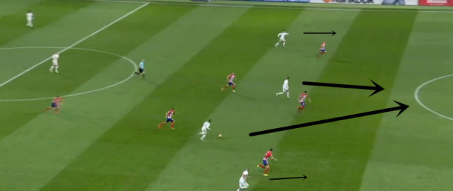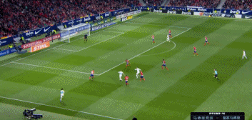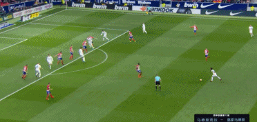 如图正是莫德里奇在右路抓住马竞失误打出反击,高速带球连续突破后伊斯科、C罗、本泽马分别在左路、中路和右路包抄,马竞难得防守出现漏洞,但很可惜C罗接球后的射门还是被奥布拉克破坏了。