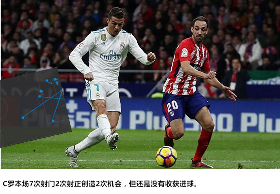 皇马在上一场与拉斯帕尔马斯的比赛中就显露出阵地战低迷、缺少进攻方案的问题,只不过那场比赛利用定位球二度得分掩盖了进攻乏力的事实。此役对阵马竞,皇马打正的机会很少,除了C罗两次任意球之外几乎没有威胁射门。