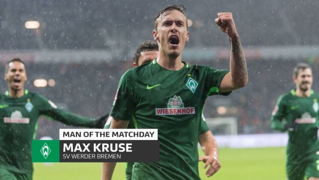 德甲官方评选的当轮最佳:不莱梅前锋克鲁泽