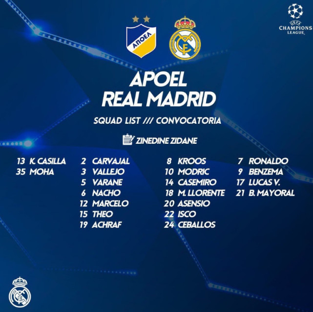 齐达内赛前一天公布大名单,马德里德比鼻骨骨折的拉莫斯因伤倦勤,西媒透露皇马队长将缺席10天,错过本轮欧冠、下轮联赛及下周国王杯赛事,但不会动手术。纳瓦斯与贝尔依然在养伤,科瓦契奇虽接近归队,但复出参赛尚需时日,卡瓦哈尔进入名单,不过他距欧冠停赛只差1张黄牌。