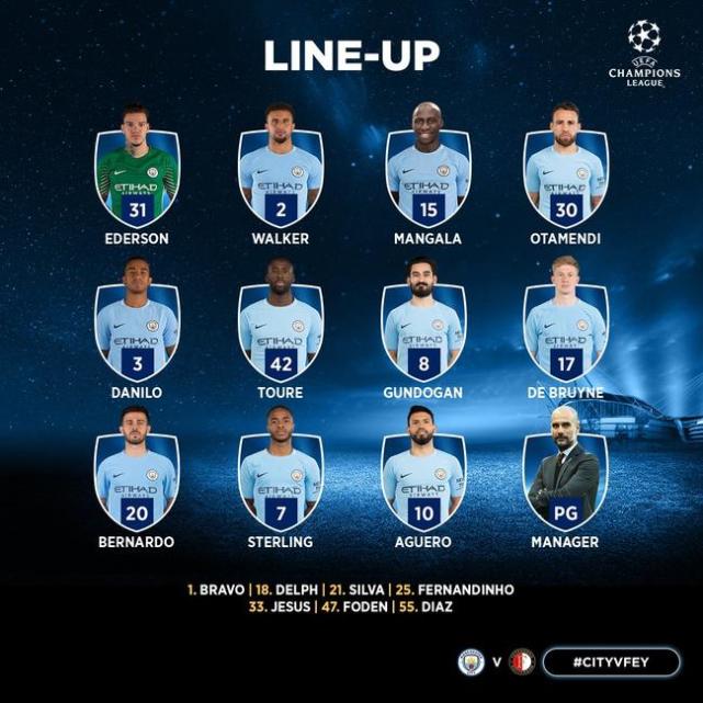 腾讯体育讯 北京时间22日凌晨3时45分,欧冠小组赛F组第五轮,曼城主场对阵费耶诺德队。腾讯体育将带来视频直播。赛前双方首发阵容已公布。由于曼城已经提前出线,因此瓜迪奥拉对阵容进行了较大幅度的轮换,达尼洛、曼加拉、图雷、贝尔纳多-席尔瓦、斯特林等人轮换出场,阿圭罗领衔锋线,只差一张黄牌就将停赛的德布劳内继续首发出场。