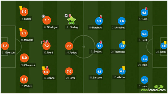 B席从右边锋收到右中场,代替德布劳内的角色。他被认为是大卫-席尔瓦的接班人,踢右中场,既可以扯到边路盘带,又可以收到中路与队友进行配合。9分钟后,葡萄牙国脚就为阿圭罗送上精妙挑传,可惜阿根廷前锋胸部停球后转身射门打偏。而两名边后卫凯尔-沃克和达尼洛也内收到中路,实际上扮演后腰的角色。