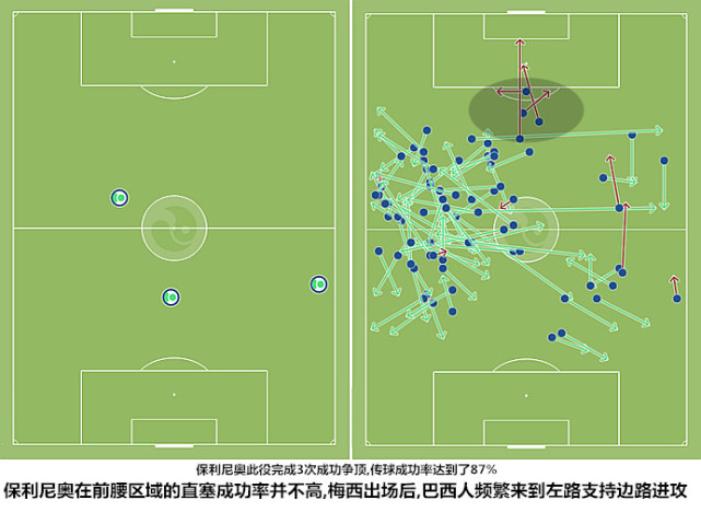 保利尼奥擅长前插、护球且勇于对抗的特点令他可以胜任梅西和苏亚雷斯身边的“临时中锋”角色,巴西人在得球之后一般会有一个不太明显的停顿观察再横向寻求联系的过程,这种精细化的处理球方式既能吸引防守为梅西和苏亚雷斯制造空间,也可以增加巴萨在进攻终端的横向变化。当然,尽管在分球和接应方面表现不错,但保利尼奥毕竟不是一位擅长在狭小空间内连续实施一脚传递的球员,他此役在禁区前沿的三次直塞球均没能及时联系到队友。随着比赛的深入,巴西人有意识地将自己的位置后撤了一些,他在进攻组织阶段的任务变成了就近为边路球员提供出球点以及防守尤文图斯的反击。只有在前场配合真正创造出有效的传中机会时,保利尼奥才会迅速进入射程等待射门机会。
