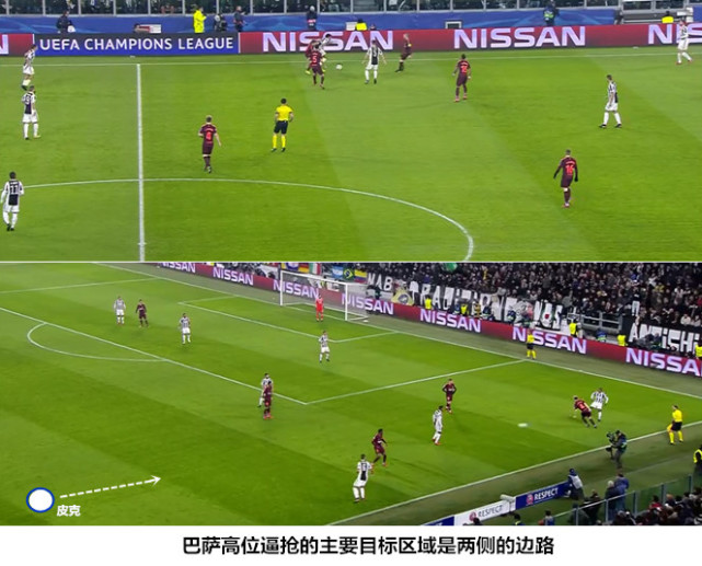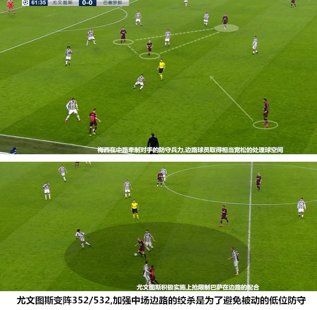 在梅西出场之后,训练有素的尤文图斯队员迅速完成了自我调整,他们的阵型有注重两翼平衡的4231切换为了注重禁区正面防守的352/532。阿莱格里一方面组建三中卫+双后腰的防守模块用来抵御梅西、苏亚雷斯和伊涅斯塔参与的中路进攻,一方面指挥球员们积极地在边路完成上抢,限制巴萨在两翼的推进和下底。在边路积极施压的目的一是可以制造反击机会,二是避免防守阵型过早地被挤压为缺少外围宽度的532,梅西在出场后不久就用一脚准确的斜长传为迪涅送出单刀机会,这足以说明边后卫在缺少保护的情况下的处境是多么危险。