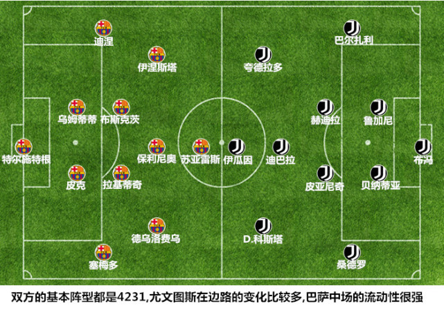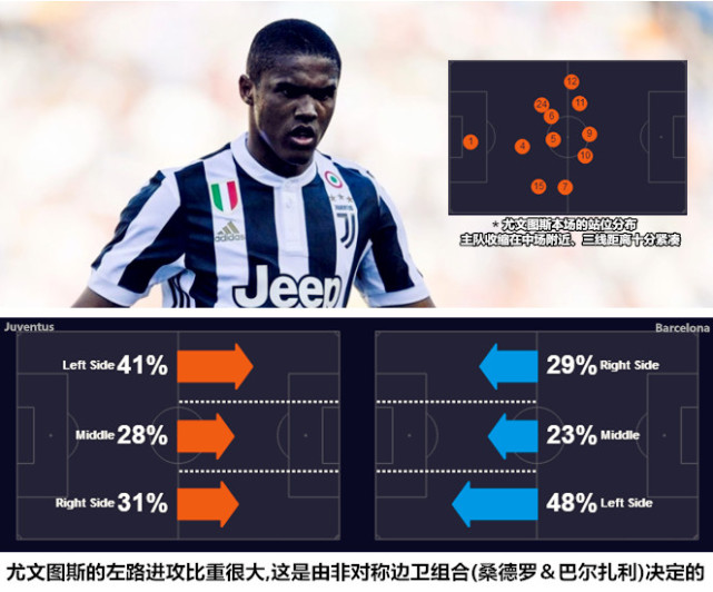 双方此役的战术蓝本均为4231,巴塞罗那球员的活动区域相对固定,享有一定自主活动权的球员是保利尼奥和德乌洛费乌,前者需要在完成中场大范围覆盖的同时积极围绕持球人跑动,利用频繁的前插为苏亚雷斯减压。尤文图斯的阵型在有球状态下会切换为3241,左后卫阿莱士-桑德罗的纵向移动推动着攻与守阶段的阵型变化,巴西人在快攻中会来到边锋位置寻求走外线下底传中的机会,道格拉斯-科斯塔有机会内收到肋部或是直接换位到右路与夸德拉多形成合力,巴西人在开场后连续在右路取得持球快攻的机会,正是得益于阿莱格里的非对称进攻模式带来的局部人数优势。