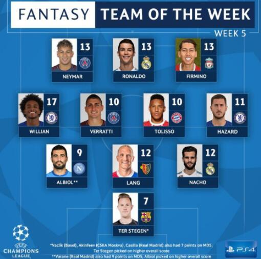 腾讯体育讯 北京时间11月23日 欧冠小组赛第5轮战罢,欧足联官方公布了本轮最佳阵容,C罗和内马尔领衔。