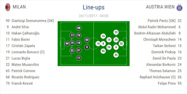 AC米兰(3-5-2):99-唐纳鲁马/22-穆萨基奥、19-博努奇、17-萨帕塔/11-博里尼、21-比格利亚、10-恰尔汗奥卢、79-凯西、68-里卡多-罗德里格斯/9-安德烈-席尔瓦、63-库特罗内
