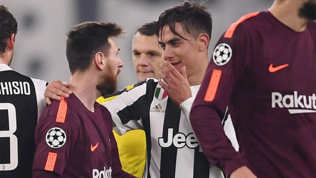 梅西和迪巴拉在俱乐部间的比赛中亲热交谈