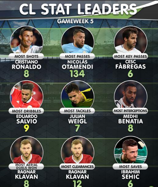 本菲卡虽然在本轮联赛输球,但是队内的右边锋塞尔维奥在进攻端威胁巨大, 全场比赛一共有过10次的过人,这也超越了内马尔,成为了本轮欧冠过人次数最多的球员。多特球员魏格尔在本轮欧冠一共贡献了7次铲球,铲球次数位居第一。