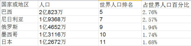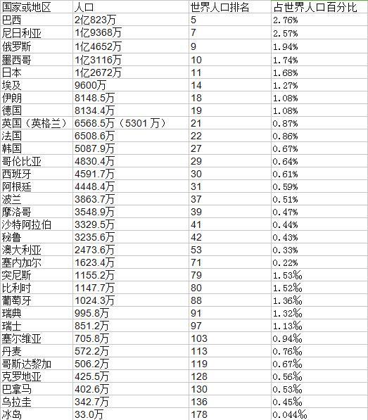 其中人口最多的国家是足球王国巴西,排名世界人口第5的巴西拥有2亿823万人口,占世界人口百分比的2.76%;非洲雄鹰尼日利亚则以1亿9368万人口位列次席,排名世界第7占世界人口2.57%的他们也是“非洲顶点”;东道主俄罗斯则以1亿4652万排名世界第9,占世界人口的1.94%的同时排名欧洲第一;而亚洲第一,也是最后一个人口超过1亿的国家是东亚近邻日本,人口1亿2672万排名世界第11。