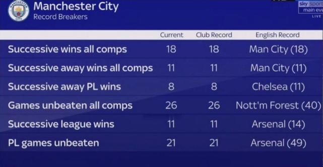 第四,英超跨赛季21场不败,同样追平蓝月亮的队史纪录,不过距离阿森纳的49场不败,还相去甚远。第五,各项赛事26场不败,继续刷新着队史纪录,而英格兰球队的不败纪录由诺丁汉森林保持,长达40场,曼城还得努力。