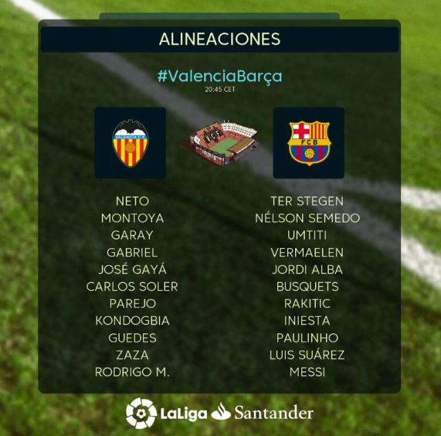 巴塞罗那(4-4-2):特尔施特根;塞梅多,乌姆蒂蒂,费尔马伦,阿尔瓦;拉基蒂奇,布斯克茨,保利尼奥,伊涅斯塔;梅西,苏亚雷斯