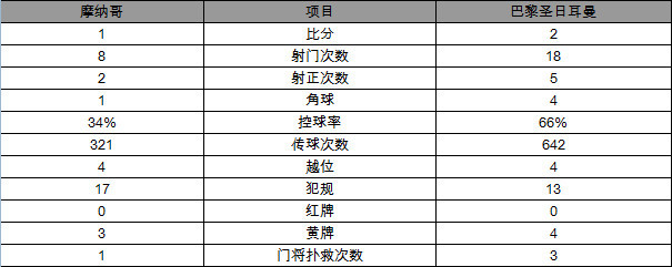 全场比赛,巴黎圣日耳曼18次攻门5次射正收获两球,摩纳哥8次攻门2次射正打入1球。巴黎控球率达到66%,摩纳哥则为34%。