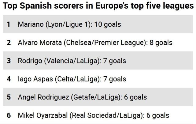 事实上,本赛季的欧洲五大联赛里,进球最多的西班牙人就是马里亚诺和莫拉塔,他们分别排名第一和第二。位居第三位的是瓦伦西亚的罗德里戈打入7球,他也曾效力过皇马,塞尔塔的阿斯帕斯也是打入7球。赫塔菲的安赫尔-罗德里格斯和皇家社会的奥亚尔萨巴尔打入了6球。