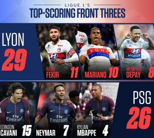 腾讯体育讯 北京时间11月27日 法甲联赛第14轮比赛全部战罢,巴黎击败了摩纳哥获得了胜利,而在本轮比赛过后,巴黎38个积分领先排名第二的里昂9分位居榜首。巴黎的成功离不开队内卡瓦尼、内马尔以及姆巴佩的进攻组合的巨大威力,但是三人却并非是法甲赛场攻击力最强大的三叉戟组合。里昂的费基尔、马里亚诺以及德佩在前14轮法甲打入29球,领先CNM组合。