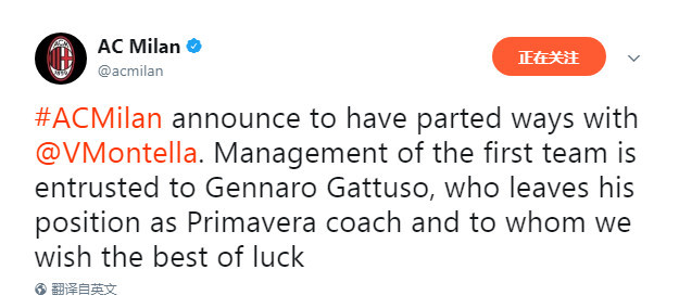 米兰官方宣布蒙特拉下课