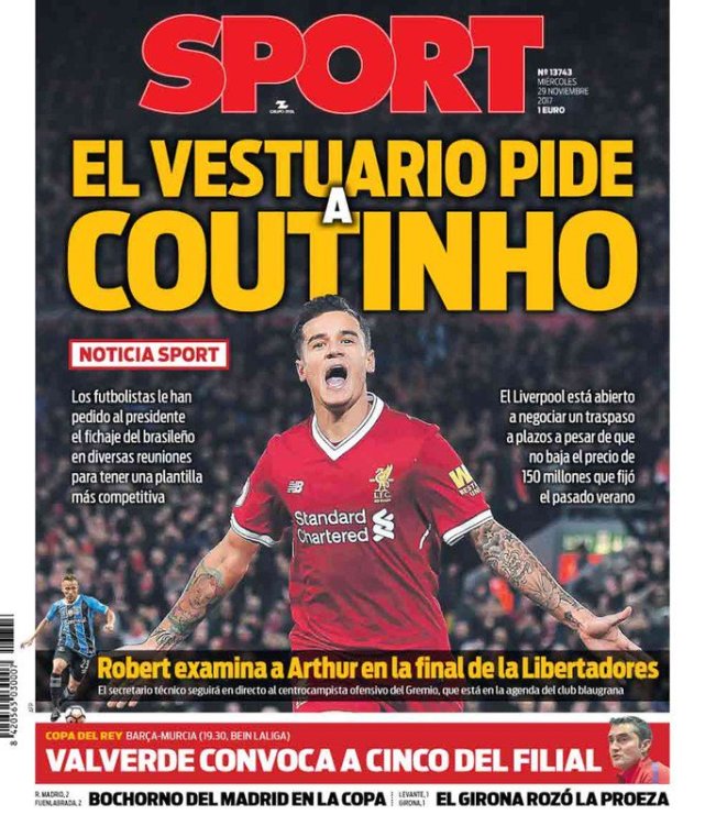 腾讯体育讯 北京时间11月29日,来自西班牙《每日体育报》的消息,巴萨的更衣室球员希望俱乐部可以在1月份签下库蒂尼奥,但是在追求巴西球星的交易上,巴萨没有太多进展,因为利物浦的要价依然是1.5亿欧元,按照这样的趋势,这笔交易很可能泡汤。