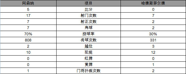 全场比赛,阿森纳17次攻门7次射正打入5球,哈德斯菲尔德7次攻门2次射正颗粒无收。阿森纳控球率达到70%,哈德斯菲尔德只有30%。
