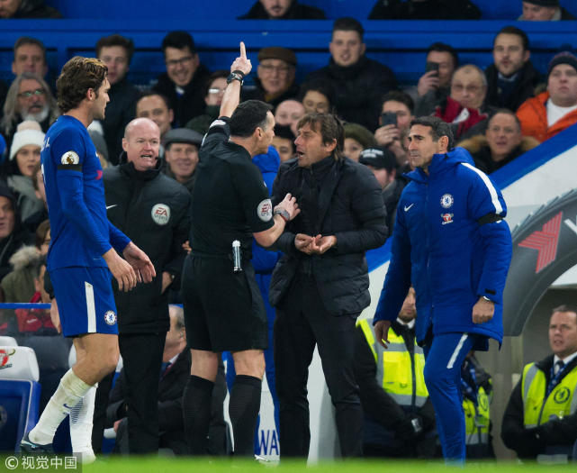 看到主裁判判罚球门球之后,孔蒂不停的在边线怒吼,斯瓦布里克随即向蓝军主帅出示了红牌。孔蒂先是走上替补席后的看台,但这并不符合规则,孔蒂之后被迫离开了看台,走回了更衣室。上半场结束之后,切尔西球迷向主裁判发出了嘘声,法布雷加斯、阿隆索都在继续抱怨。