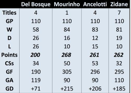 齐达内在接手皇马不到两年的时间里一共带队110场,获得七个冠军,获得冠军次数四人最多,在110场比赛中获得81胜19胜10负的成绩,110场比赛一共获得262个积分,在四人之中,仅次于穆里尼奥,高于安切洛蒂以及博斯克。